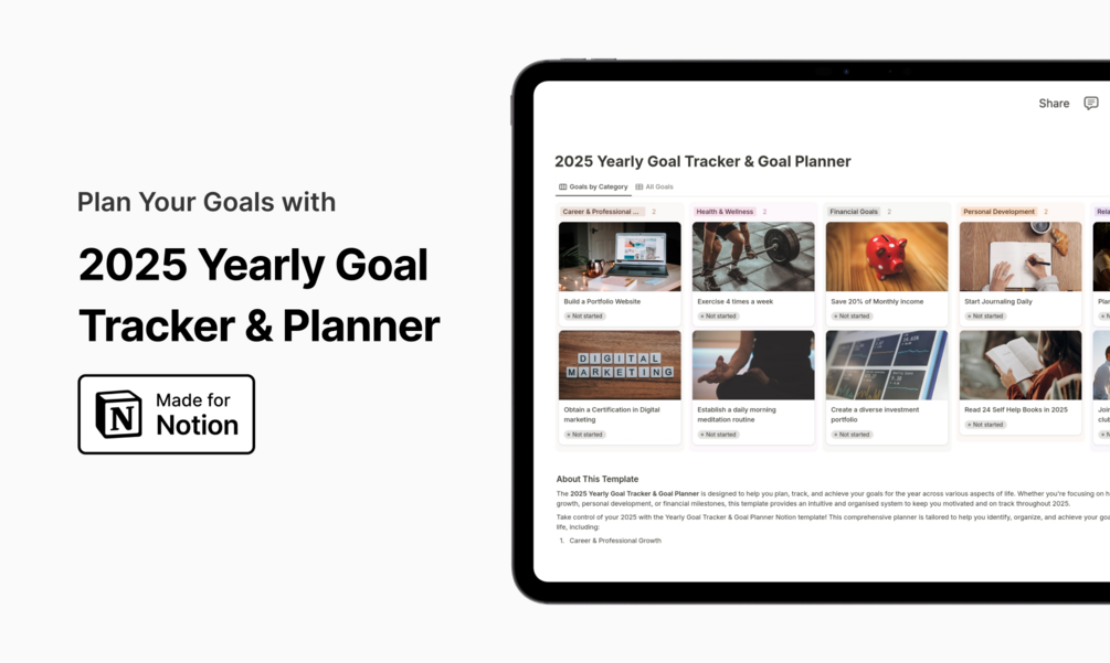 Take control of your 2025 with the Yearly Goal Tracker & Vision Board Notion template!