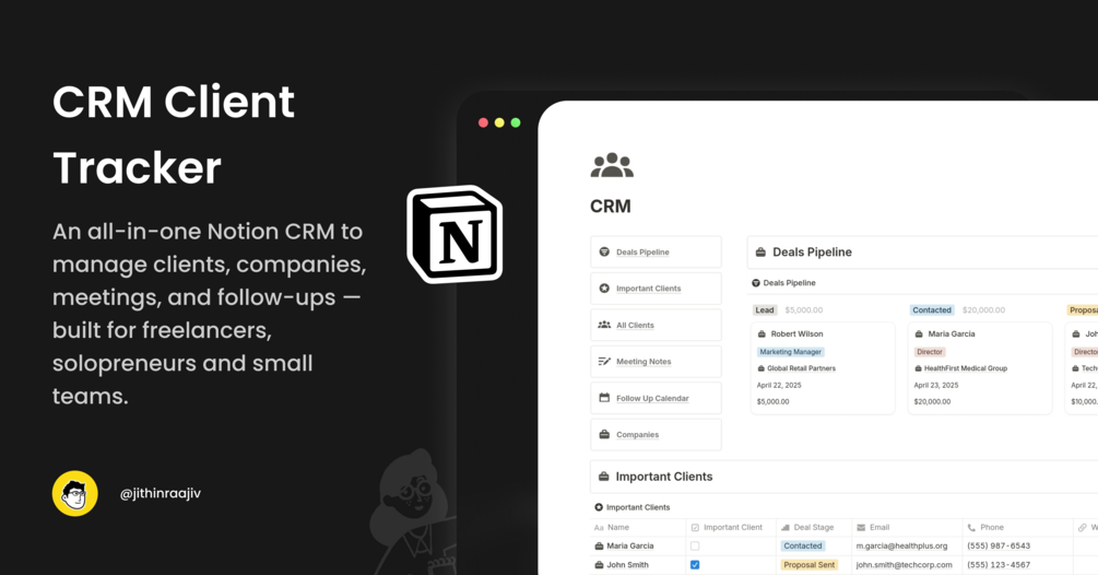 Organize your clients, meetings & deals – all in one clean Notion workspace.