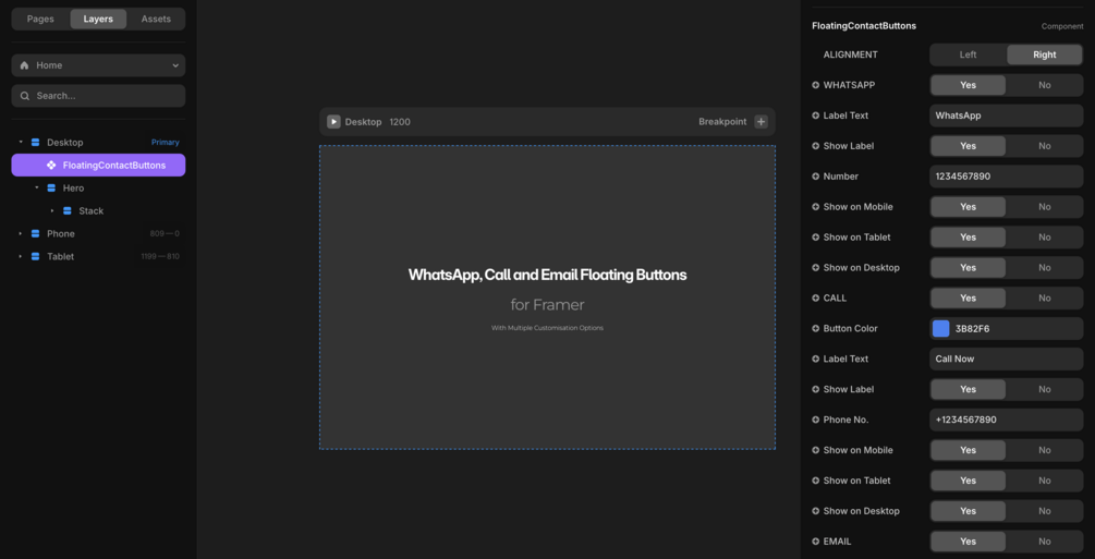 WhatsApp, Call & Mail Floating Contact Button Component for Framer