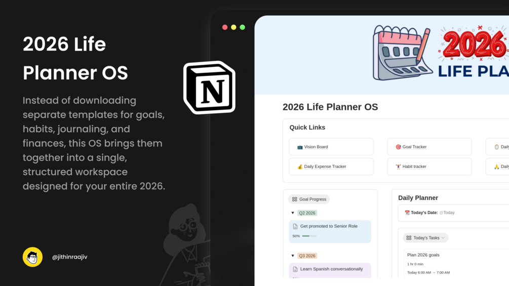 2026 Life Planner OS is a complete life operating system built in Notion to help you: