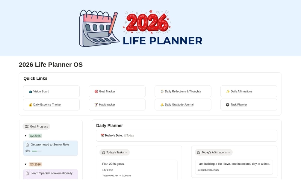 Get instant access to the 2026 Life Planner OS and start running your entire year from one clean, connected Notion system.